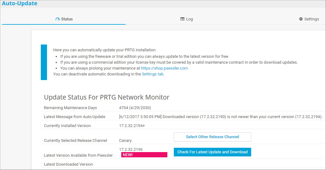- Automatically download and install the latest version: PRTG automatically downloads and installs any new version as soon as PRTG detects that a newer version is available (PRTG checks this once per day).