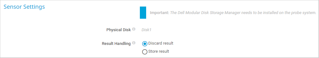 This sensor requires the installation of the Dell Modular Disk Storage Manager program. You have to install it on the probe system (on every cluster node, if on a cluster probe). For details about setup, see section More below.