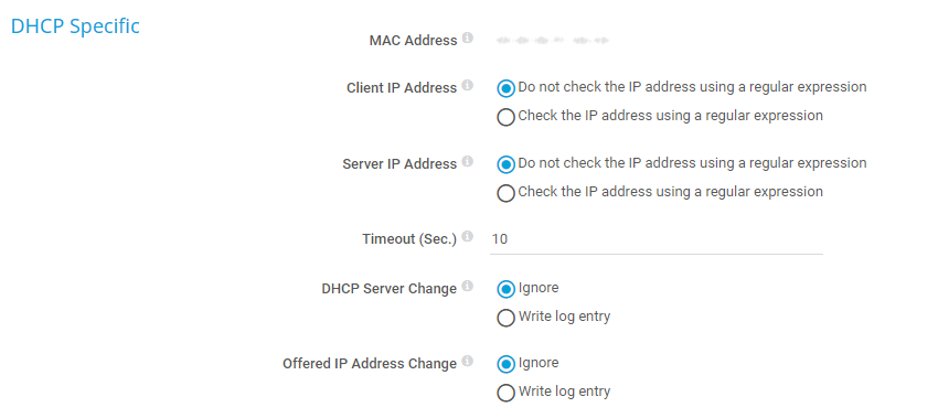 For example, enter 10\.0\.5\..* to make sure that any answering DHCP server returns any client IP address starting with 10.0.5.. If it does not, the sensor shows the Down status. Leave this field empty if you do not want to use it.