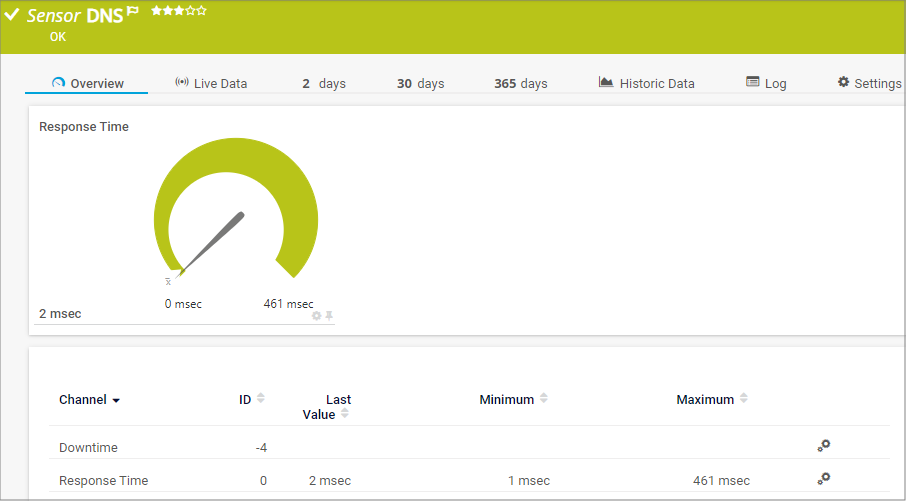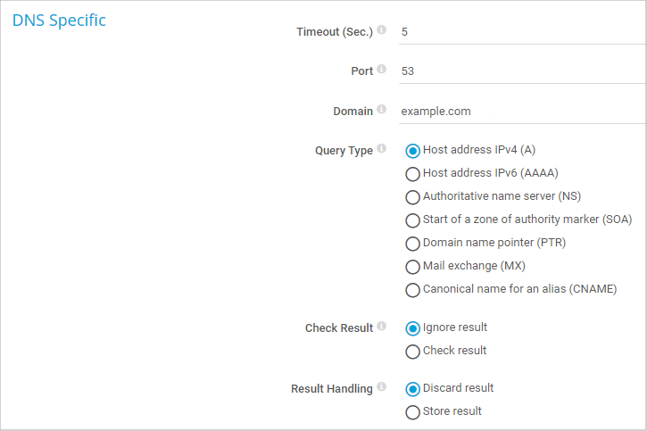 The DNS sensor monitors a Domain Name System (DNS) server. It resolves a domain name and compares it to a specific IP address. The sensor checks the answer section as well as the additional section, if one was sent.