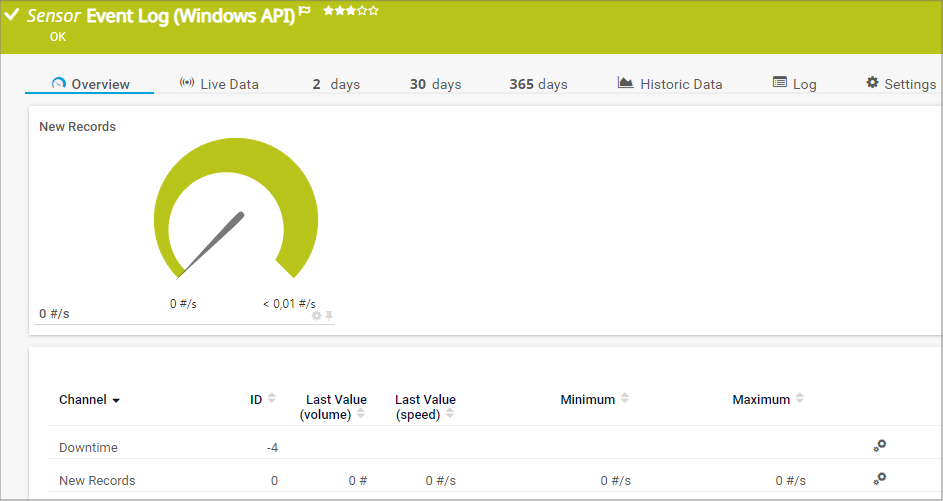 The Event Log (Windows API) sensor monitors Event Log entries via the Windows application programming interface (API).
