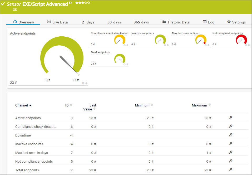 In the channel table on the Overview tab, this channel never shows any values. PRTG uses this channel in graphs and reports to show the amount of time in which the sensor was in the Down status in percent.