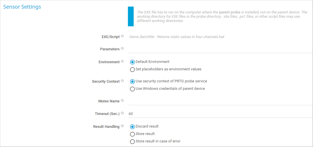 - Store result: Store the last sensor result in the \Logs\sensors subfolder of the PRTG data directory on the probe system. The file names are Result of Sensor [ID].txt and Result of Sensor [ID].Data.txt. This setting is for debugging purposes. PRTG overwrites these files with each scanning interval.