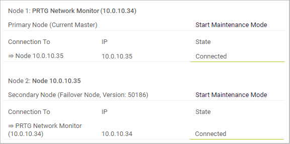 In two browser windows, log in to the PRTG web interfaces of both of your PRTG core servers. Open the Cluster Status tab in both windows. You should see the cluster status with the two cluster nodes in a Connected state after a few minutes.