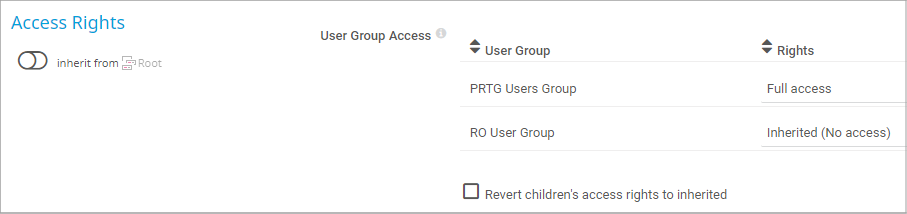- No access: Users in this user group cannot see or edit the sensor. The sensor neither shows up in lists nor in the device tree.