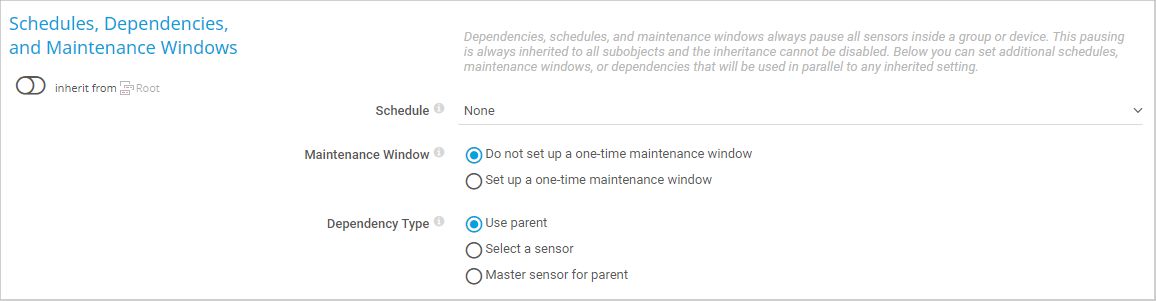 You cannot interrupt the inheritance for schedules, dependencies, and maintenance windows. The corresponding settings from the parent objects are always active. However, you can define additional schedules, dependencies, and maintenance windows. They are active at the same time as the parent objects' settings.