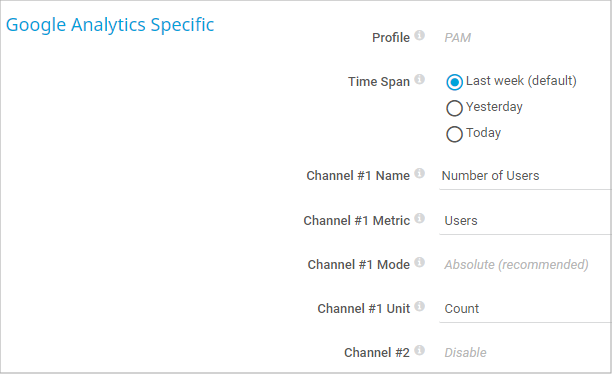This setting is only visible if you select Custom Metric above. Enter the identifier of the metric that you want to monitor. Enter it exactly as it is shown in Google Analytics. Metric identifiers always start with ga:. Enter a string.