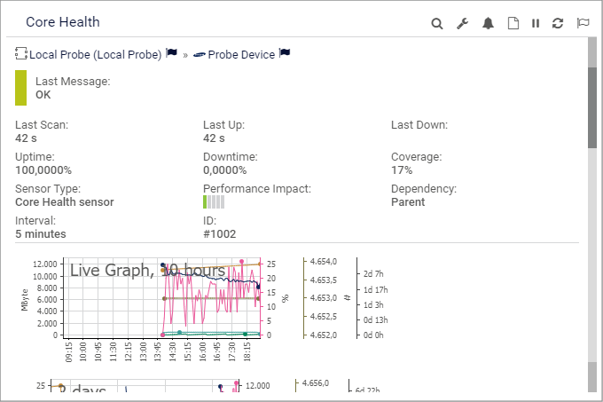 When you rest the mouse pointer over an object's icon in the device tree or in table lists, for example, a hover popup window appears and shows details about this object.The hover popup contains information from the object's Overview tab as well as several graphs. The exact information that PRTG provides depends on the type of object.