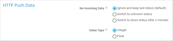 This setting is only visible if you select Switch to down status after x minutes above. Enter a time threshold in minutes. If this time elapses, the sensor shows the Down status if it does not receive a push message within this time span.