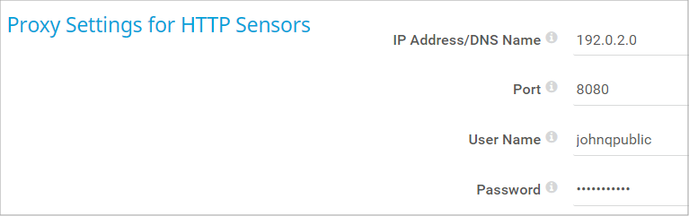 The proxy settings determine how a sensor connects to a URL. You can enter data for an HTTP proxy server that sensors use when they connect via HTTP or HTTPS.