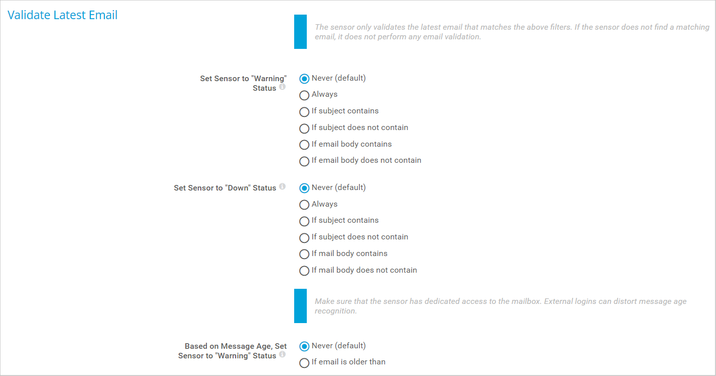 The sensor can check the content of emails for certain keywords. This way, you can use the sensor to monitor backup solutions via emails that are sent by these solutions. For more information, see the Knowledge Base: How can I monitor my backup software to be sure backup succeeded last night?