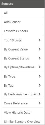 Click to open a list of all sensors. Hover over Sensors in the main menu bar to show other options.