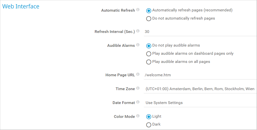 This setting is only visible if you select Automatically refresh pages (recommended) above. Enter the number of seconds that PRTG waits between two refreshes. We recommend that you use 30 seconds or more. The minimum value is 20 seconds.