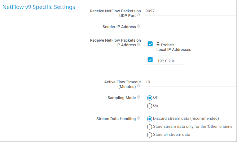If the target device sends incorrect time information that results in wrong monitoring data, try to use 0 as active flow timeout. This ignores the start and stop information of a flow as provided by the device and accounts all data to the current point in time. It might result in spikes but all data is captured.