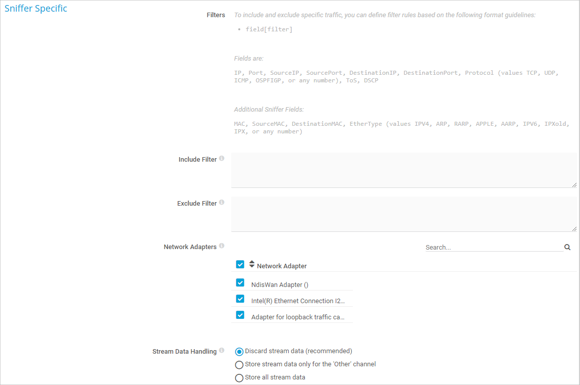 - Discard stream data (recommended): Do not store the stream and packet data.