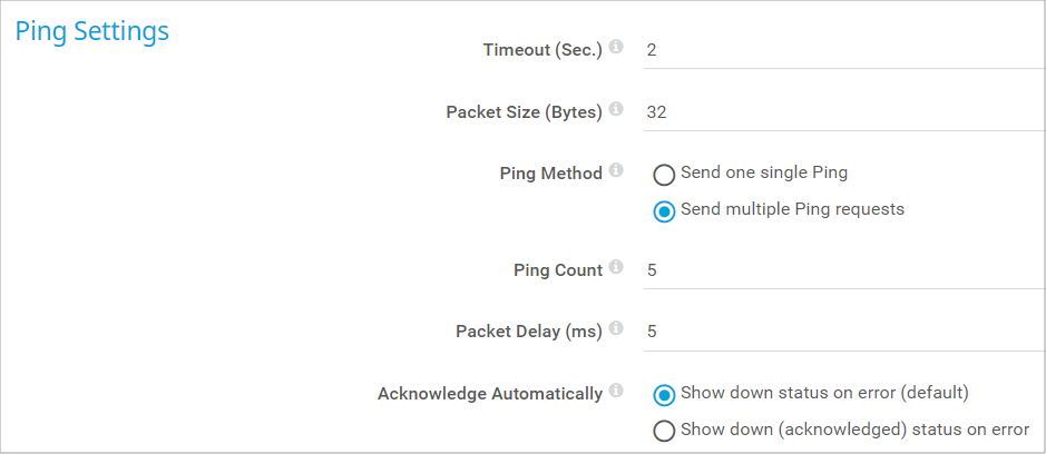 This setting is only visible if you select Send multiple Ping requests above. Enter the number of Pings that the sensor sends in a row in one scanning interval. Enter an integer value. The default value is 5.
