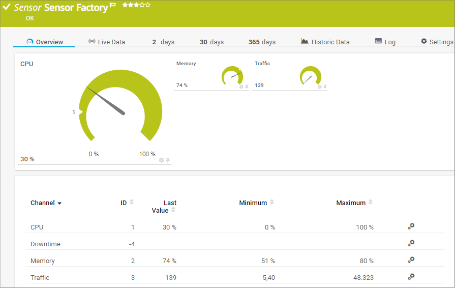 - Show warning status when one or more source sensors are in down status: If at least one source sensor that you use in a channel definition is in the Down status, the Sensor Factory sensor shows the Warning status until all referred sensors leave the Down status.