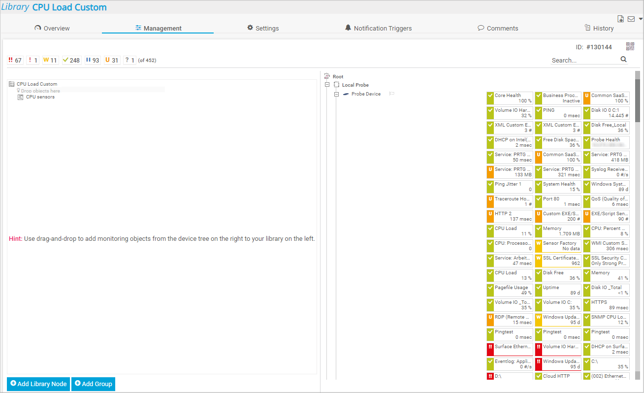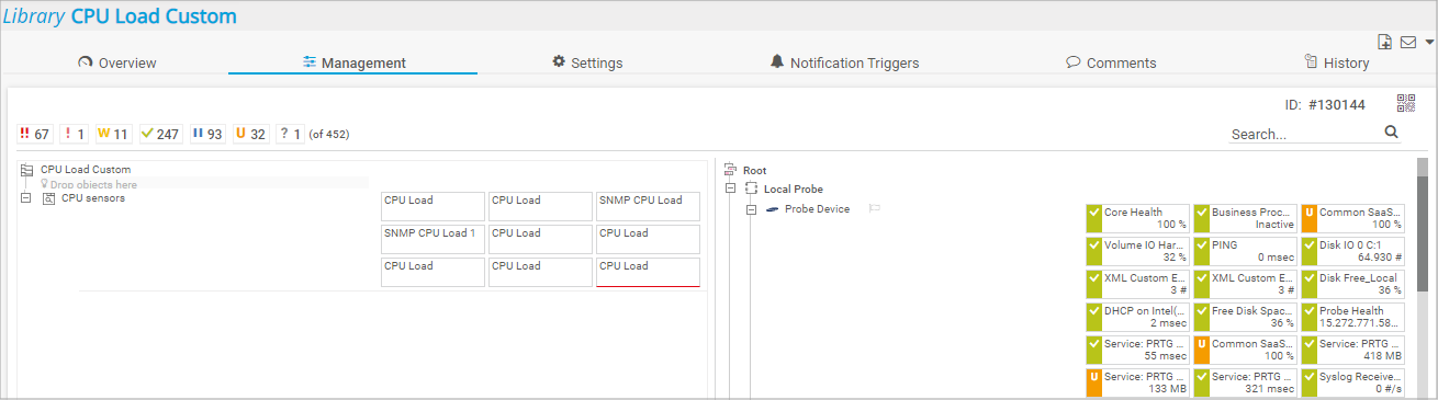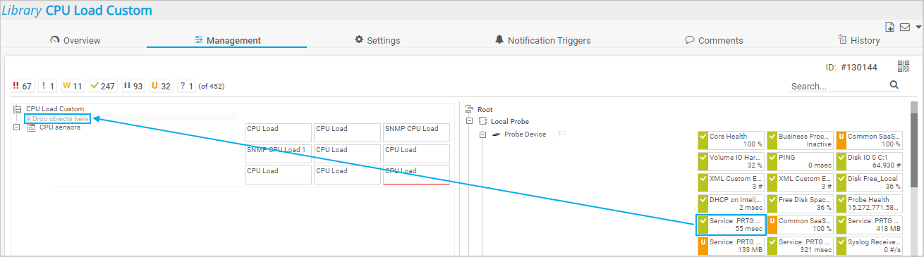 This section gives you an example of how you can reorganize the objects from your device tree in a library to create a customized view of your CPU sensors. This way, you can monitor an entire section of your network with a single set of notifications.