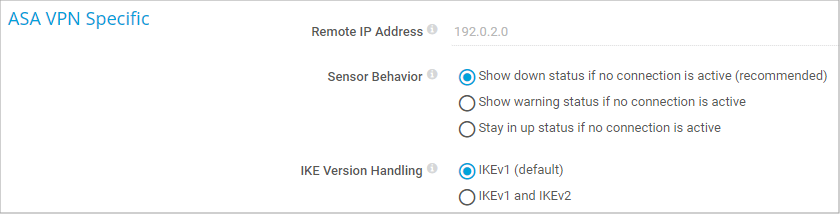 The SNMP Cisco ASA VPN Traffic sensor monitors the traffic of an Internet Protocol Security (IPsec) VPN connection on a Cisco Adaptive Security Appliance via the Simple Network Management Protocol (SNMP).