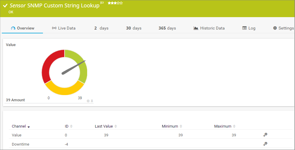 If a retrieved string matches one of the text values, the sensor maps it into the defined integer value ("reverse lookup") that is shown, for example, in data graphs. Depending on the integer, the sensor shows the respective status and converts the integer back to the original string to show it as a channel value. If the OID returns a string that the lookup definition does not contain, the sensor shows the Down status with a corresponding error message.