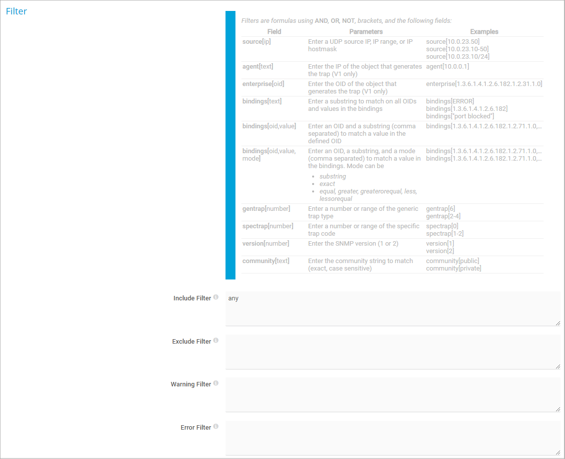 You can use include and exclude filters to define which traps to monitor or use warning and error filters to define how to categorize received traps. Provide these filters in the sensor settings as formulas. Formulas are fields that you can combine with boolean operators (AND, OR, NOT) and brackets.
