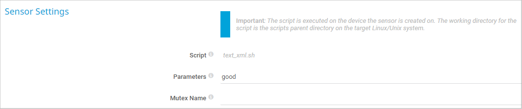 Select a script file from the dropdown list. It shows all script files that are available in the /var/prtg/scripts directory on the target Linux/Unix system. For a script file to appear in this list, store the target file in this directory.