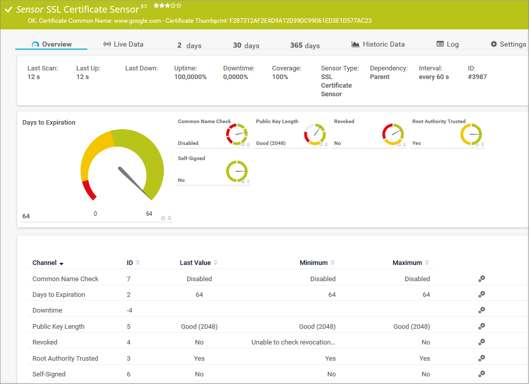 The SSL Certificate sensor monitors the certificate of a Secure Sockets Layer (SSL)/Transport Layer Security (TLS) secured connection.