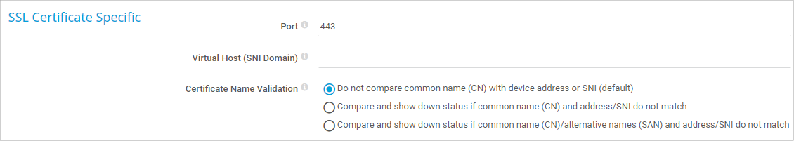 - Compare and show down status if common name (CN)/alternative names (SAN) and address/SNI do not match: Check the common name and the Subject Alternative Names (SAN) to validate the certificate. If you define an SNI domain above, the sensor compares the common name and alternative names with the SNI. If you do not define an SNI, the sensor uses the host address of the parent device. If the common name or alternative names and the checked address/SNI do not match, the sensor shows the Down status.