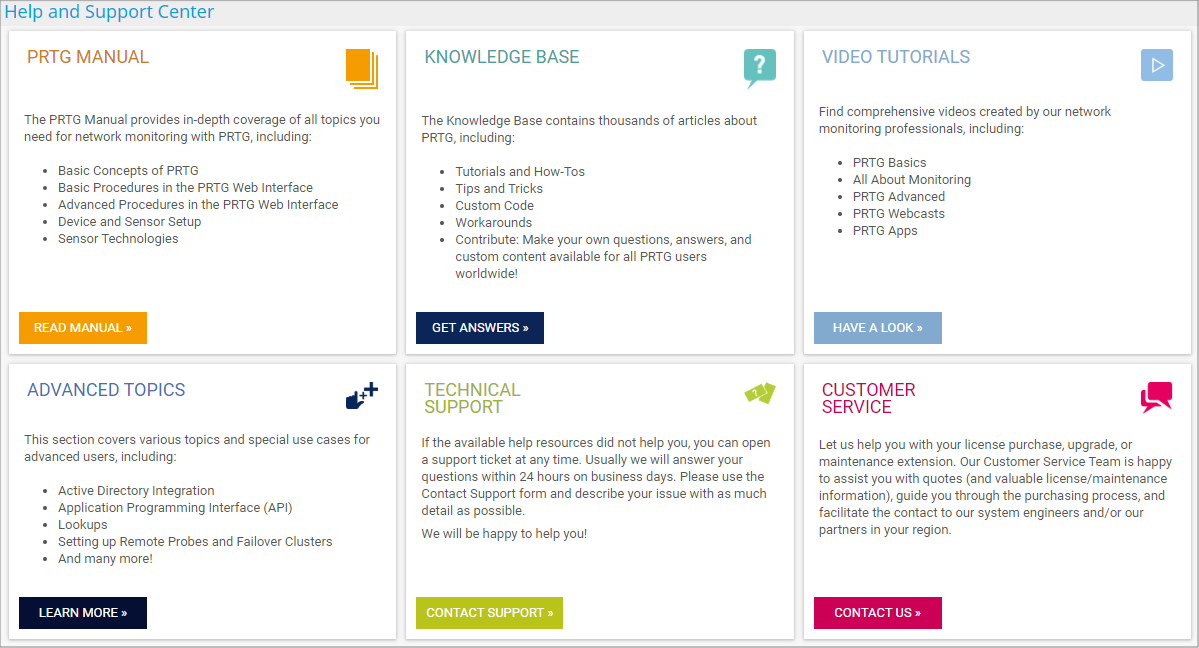 The Help and Support Center is where you can access the PRTG Manual, the Knowledge Base, and video tutorials. You can also open support tickets and contact our customer service.