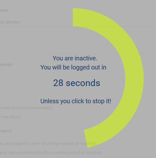 If the value you enter here is greater than 1 minute, a logout countdown appears 1 minute before you are logged out. If the value is 1 minute, you see the logout countdown 30 seconds before you are logged out. Click in the browser to stop the countdown and stay logged in.