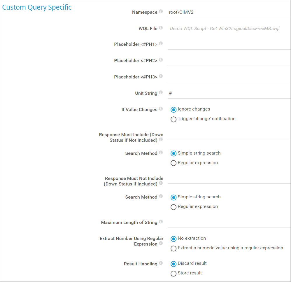 The WMI Custom String sensor performs a custom string query via Windows Management Instrumentation (WMI).