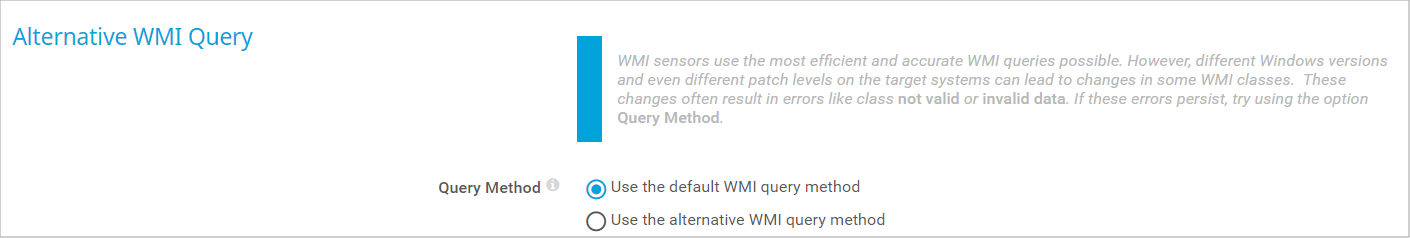 - Use the alternative WMI query method: Use an alternative method to query WMI for better compatibility if WMI sensors return errors such as class not valid or invalid data.